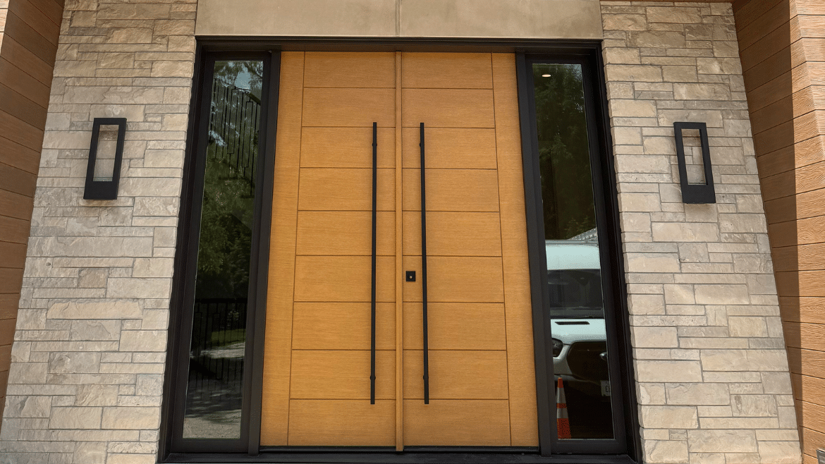 read more An overview of a front door design in this modern new construction home in Northfield, Illinois, hosted by architect…