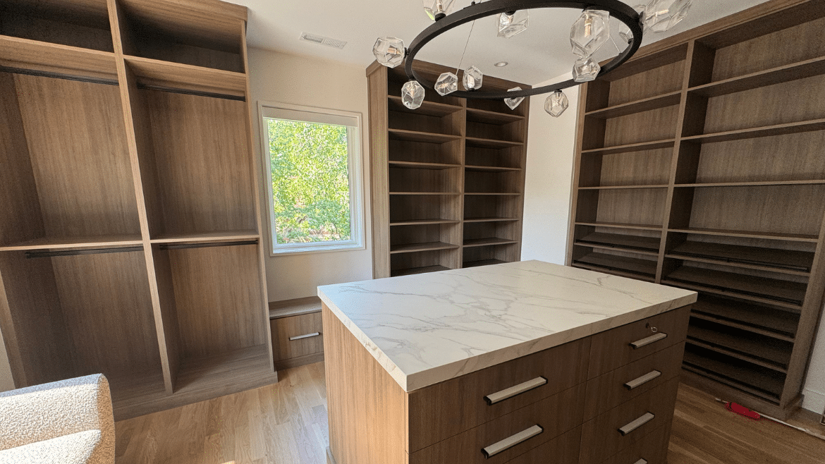 read more An overview of a gracious primary bedroom closet in this modern new construction home in Northfield, Illinois, hosted by…