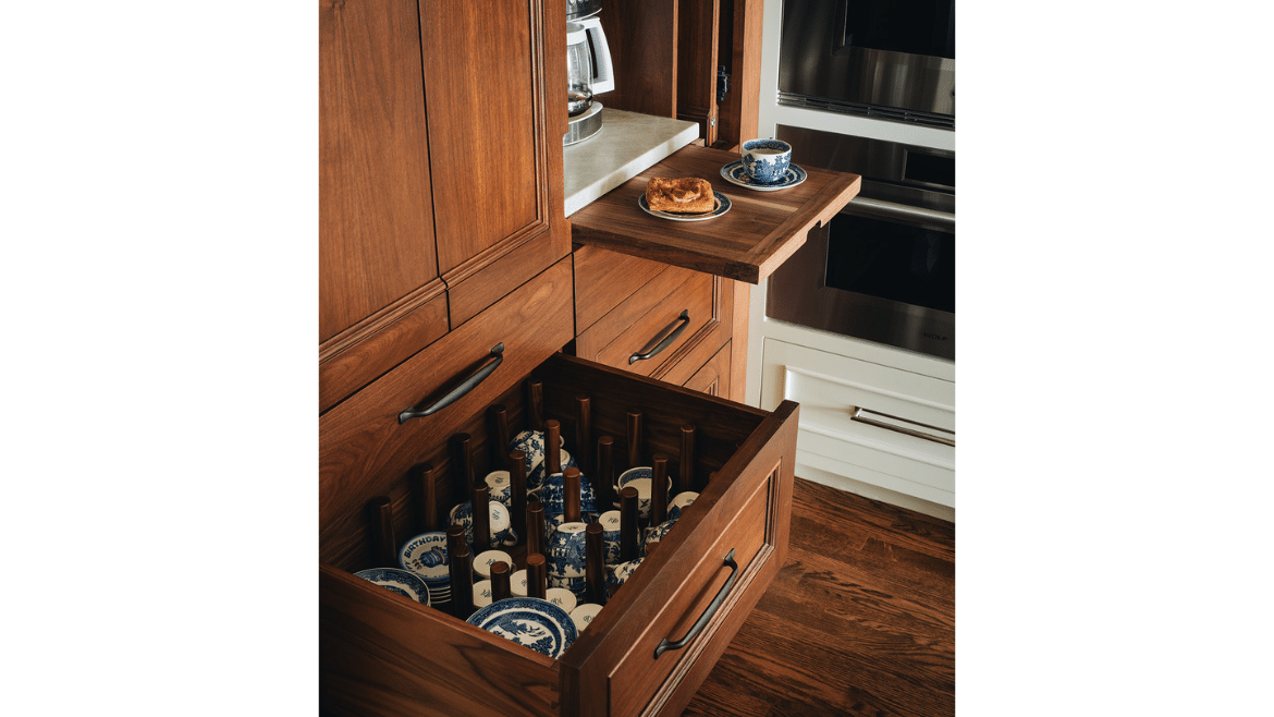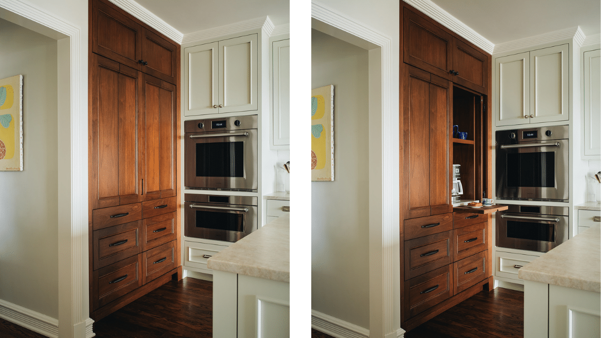 - Concealing countertop appliances in the kitchen walnut cabinet that feels like furniture, designed with wheelchair access in mind, with bi-folding and pocketing doors for convenience