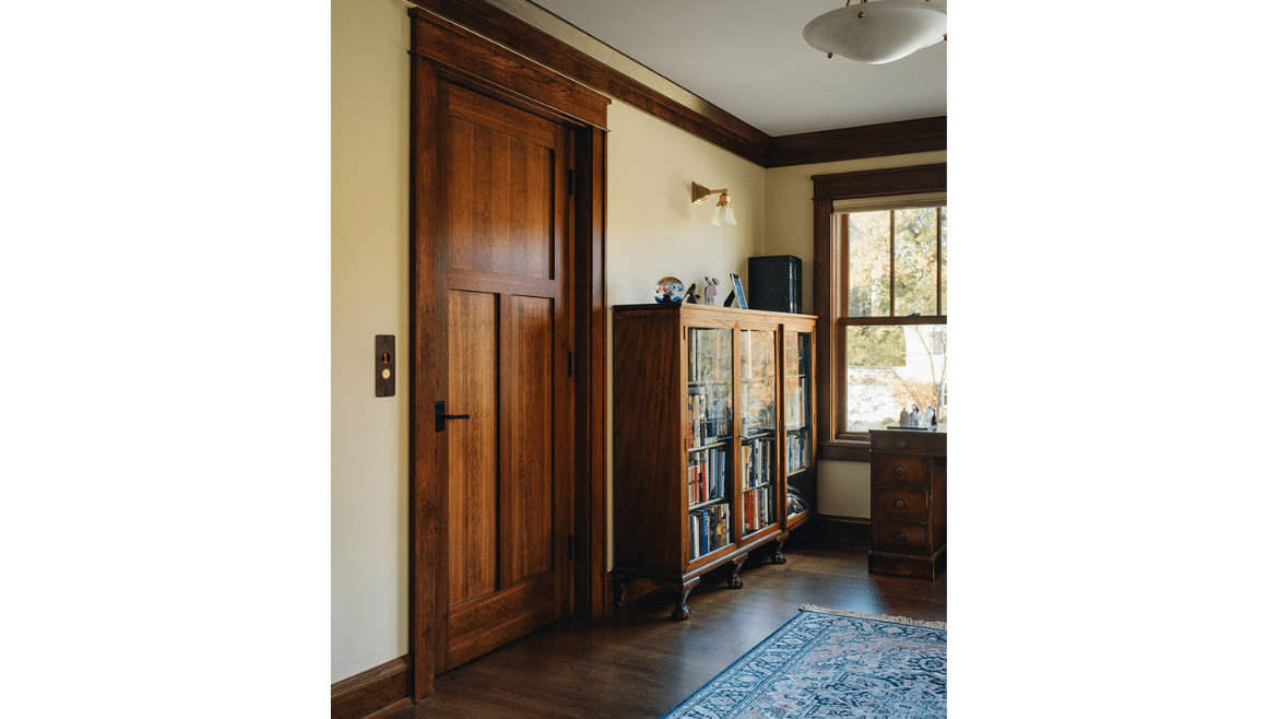 - We prioritized preservation of sentimental pieces like the original front door, which now acts as the door to the primary wing and the original fireplace wood paneling, now in place as an accent wall.