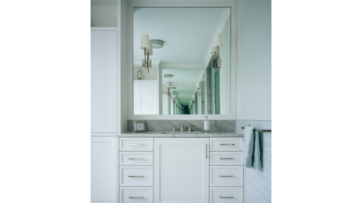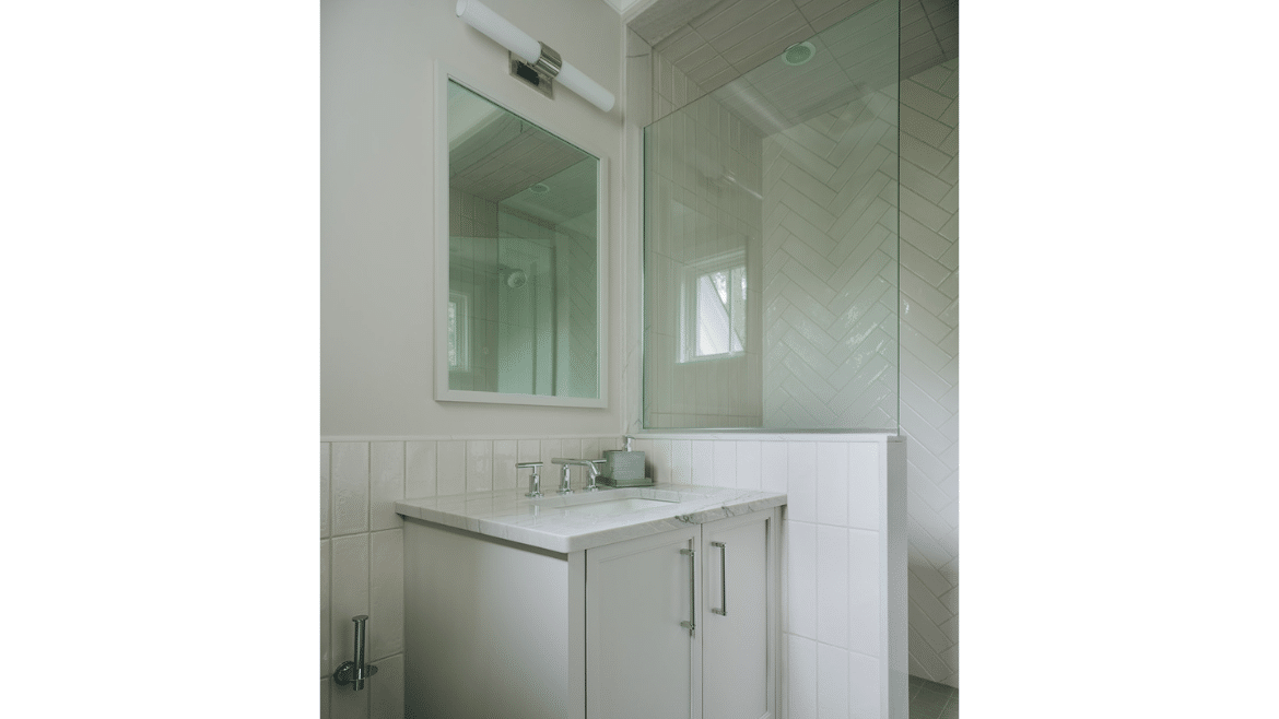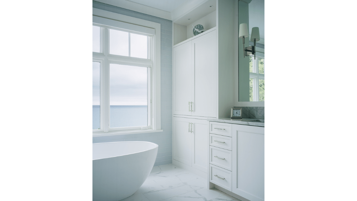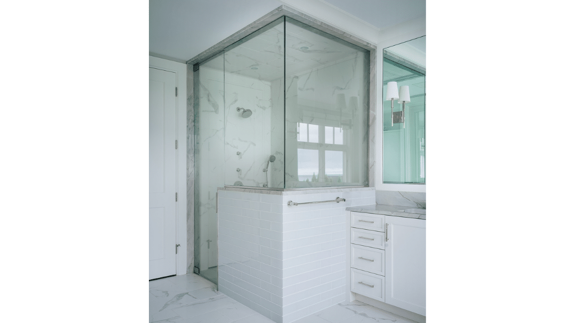 Another advantage when you take design all the way through construction is it invites innovation. During an on-site construction meeting on this project, the homeowner was standing where we had rough framed in the primary shower and said, “I want to be able to take a shower and watch the lake” – so we made a field change to expand and open up a corner to frame the lake from both the bathtub and the shower. Being flexible and creative while working together always makes the outcome better and the house really becomes what an owner envisions.