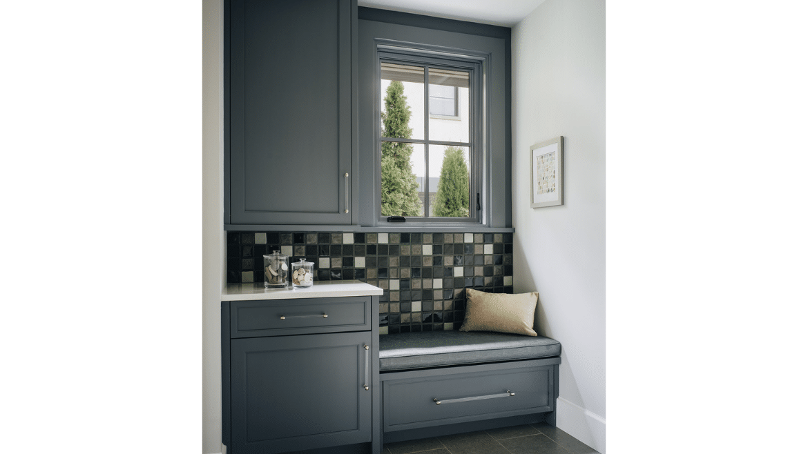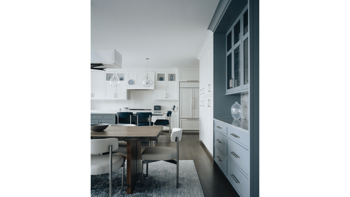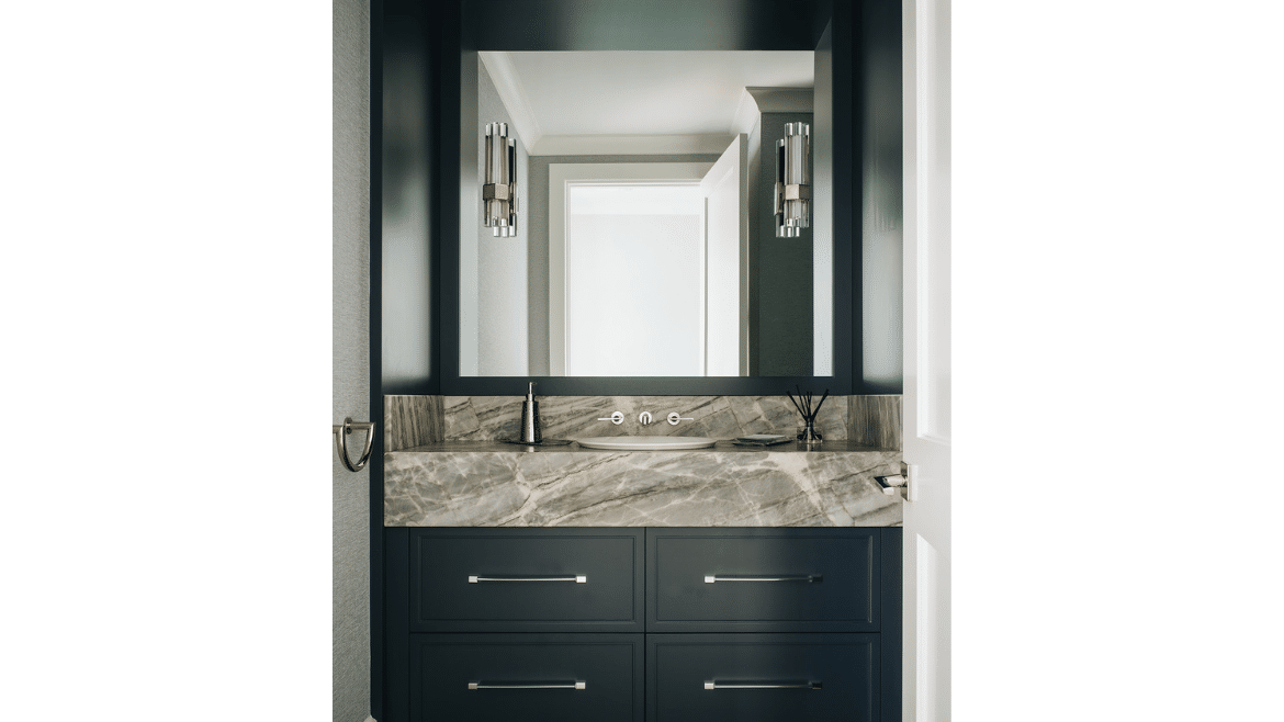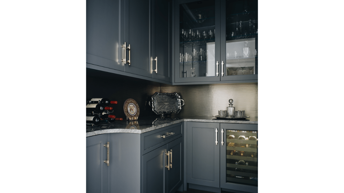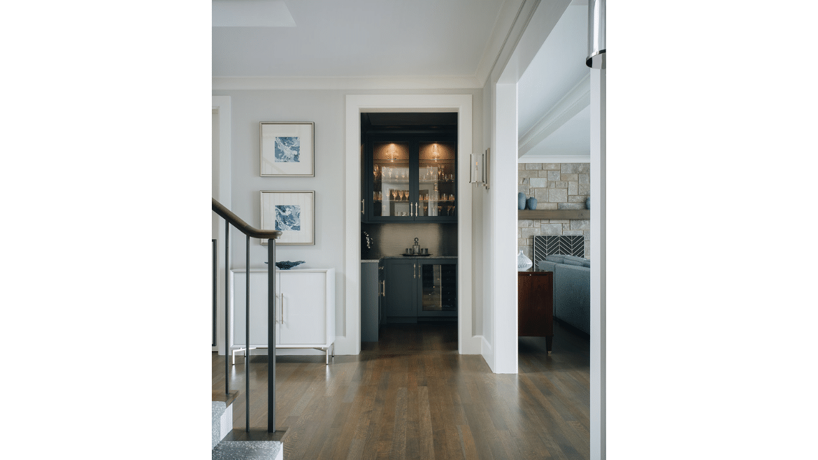 Right off the entry hall we created a little jewel box of a room that is the owner’s bar. We painted the cabinets, the trim, the wall, even the ceiling, all the same really beautiful charcoal blue. It has built-in refrigeration, glass cabinets for storage and display and a big accent wall with specialty lighting for art. That, combined with the beautiful quartzite counter, gives the space a moody personality – a little bit of a darker space compared to the rest of the house, which is neutral.