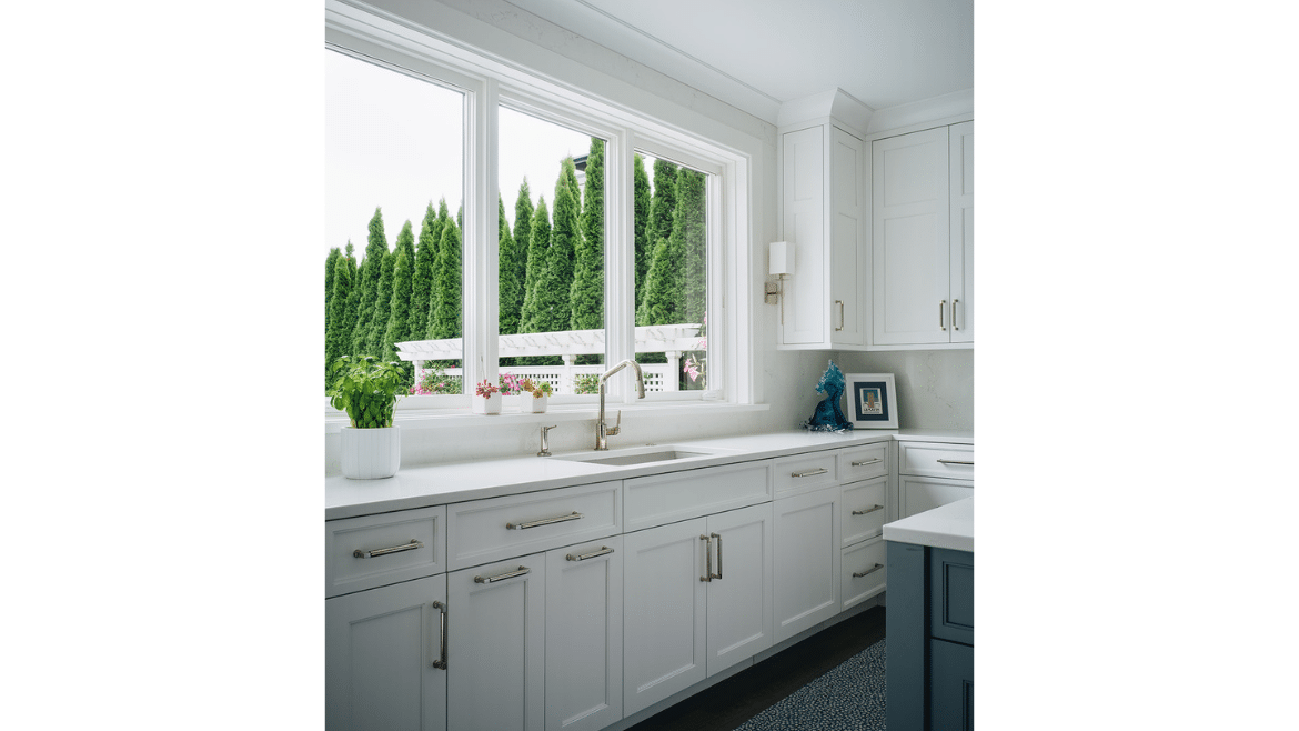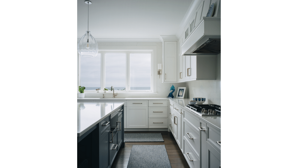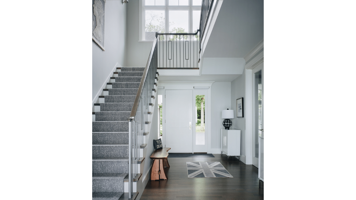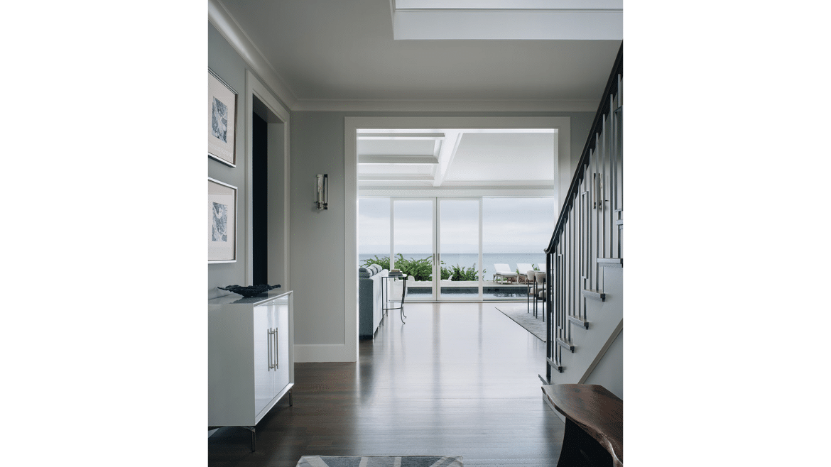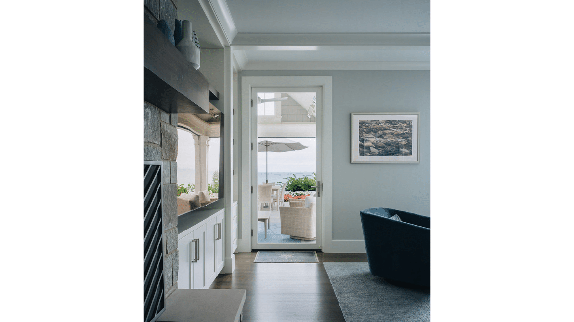 Lake views begin immediately, as windows at the front door allow a sightline right through the home. Tall ceilings and unobstructed sightlines in the entry hall space, framed by the stairs, continue the theme, sharing nothing but beautiful horizon in front of you. Even the windows on the house were custom constructed based on the homeowners’ height – with a fixed transom above a lower casement window and no muntins – so that they wouldn’t have anything impeding their view.