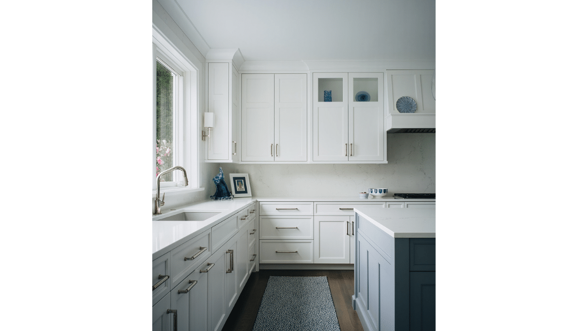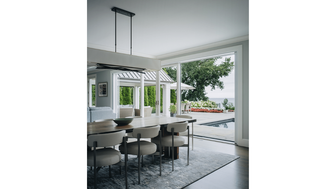 A stunning wall of glass in the open concept living room, dining room and kitchen provides lake views from every angle. In a great big open room like this we create distinct spaces by using trim – like a beam that bisects the main door, separating family space from dining space, further articulated architecturally by additional beams. The ceiling beams also create a sense of symmetry on a fireplace and TV wall that actually is asymmetrical. We want to make sure that the spaces are distinct, even though the room is wide-open.
